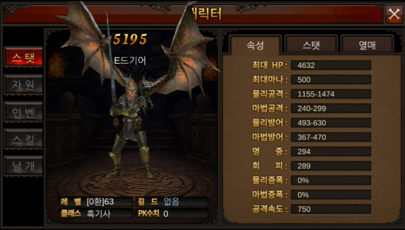 요정, 흑마법사, 흑기사 3가지의 클래스가 있으며 저는 [흑기사] 를 선택하였습니다.